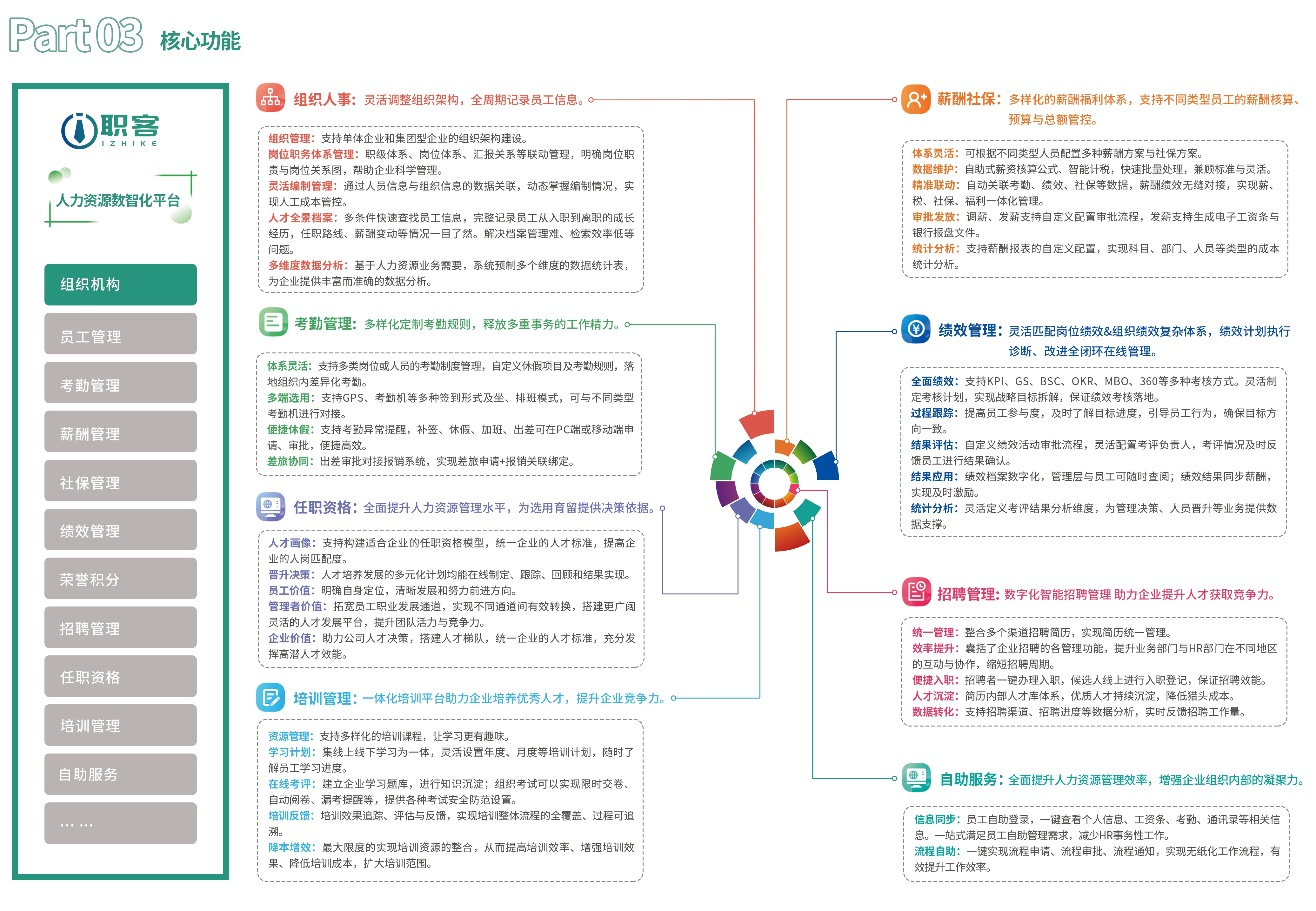 漢哲i職客支持單體企業(yè)或中型集團(tuán)企業(yè)使用,支持平衡計(jì)分卡、KP1、OKR、360等多種考核方式混合使用,支持崗位職能工資、寬帶薪酬、計(jì)時(shí)計(jì)件工資、提成獎(jiǎng)勵(lì)等多種類型的薪酬模式,以及針對(duì)任一組織的薪酬預(yù)算與總額管理;支持最復(fù)雜的任職資格體系搭建以及全流程評(píng)價(jià)管理:支持線上、線下一體化的培訓(xùn)計(jì)劃、課程管理、培訓(xùn)實(shí)施與效果評(píng)估。單純從各模塊的專業(yè)性來看,均可與同類單項(xiàng)產(chǎn)品媲美,對(duì)于具有一定管理基礎(chǔ)的企業(yè)來說,產(chǎn)品的功能相對(duì)全面和實(shí)用。