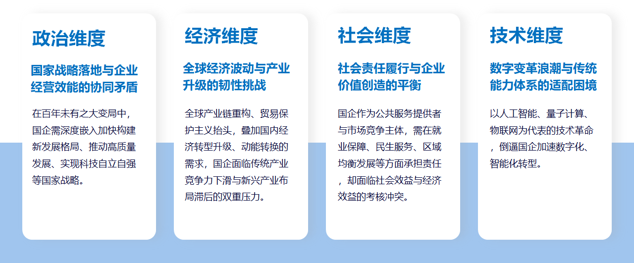 2025年開啟的十五五時期,是我國全面建設(shè)社會主義現(xiàn)代化國家的關(guān)鍵階段,也是國企深化改革、重塑競爭優(yōu)勢的戰(zhàn)略窗口期。國企作為國民經(jīng)濟的壓艙石與國家戰(zhàn)略的執(zhí)行者,既承載著鞏固公有制經(jīng)濟主體地位、服務(wù)國家重大戰(zhàn)略的政治使命,又需在全球經(jīng)濟格局深度調(diào)整、科技革命加速演進、社會治理復(fù)雜化的背景下,破解多重維度的核心矛盾,實現(xiàn)政治屬性與市場屬性的有機統(tǒng)一。