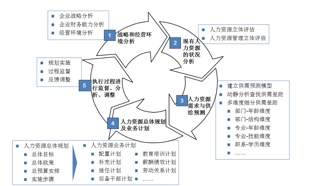 人力資源規(guī)劃(Human Resource Plan, HRP),通常也被稱為人力資源計(jì)劃,是為實(shí)施企業(yè)的發(fā)展戰(zhàn)略,完成企業(yè)的生產(chǎn)經(jīng)營(yíng)目標(biāo),根據(jù)企業(yè)內(nèi)外環(huán)境和條件的變化,通過(guò)對(duì)企業(yè)未來(lái)的人力資源的需求和供給狀況的分析及估計(jì),運(yùn)用科學(xué)的方法進(jìn)行規(guī)劃設(shè)計(jì),對(duì)人力資源的獲取、配置、使用、保護(hù)等各個(gè)環(huán)節(jié)進(jìn)行職能性策劃,制定企業(yè)人力資源供需平衡計(jì)劃以及人力資源各相關(guān)職能的發(fā)展或保障計(jì)劃,以確保組織在需要的時(shí)間和需要的崗位上,獲得各種必需的人力資源,并保證事(崗位)得其人、人盡其才,從而實(shí)現(xiàn)人力資源與其它資源的合理配置,實(shí)現(xiàn)對(duì)員工的有效激勵(lì)、開發(fā)與管理。