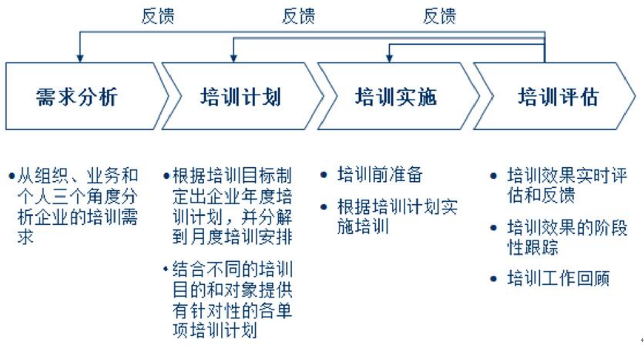 培訓(xùn)實(shí)施體系則包含了確保企業(yè)培訓(xùn)制度實(shí)施,并通過培訓(xùn)活動(dòng)的有效組織和落實(shí)、跟蹤和評(píng)估、改善和提高從而體現(xiàn)培訓(xùn)價(jià)值的一整套控制流程。