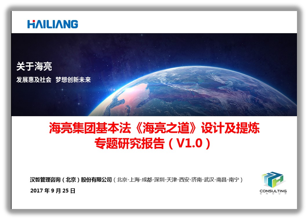 為了確保本項(xiàng)目達(dá)到新時(shí)期中國(guó)企業(yè)管理綱領(lǐng)性咨詢的新高度,漢哲咨詢集團(tuán)調(diào)集了近十位咨詢專家參與本項(xiàng)目,開(kāi)展了數(shù)千份問(wèn)卷、近五百份文件的研究,以及面向國(guó)內(nèi)外近二十家企業(yè)集團(tuán)(包括豐田、惠普、和記黃埔、復(fù)興、萬(wàn)象、比亞迪、吉利、新希望等)的綜合性研究。作為中國(guó)企業(yè)管理綱領(lǐng)類(lèi)知名咨詢作品《東風(fēng)日產(chǎn)行動(dòng)綱領(lǐng)》的起草人,漢哲咨詢首席專家段磊博士親自參與了本方案的討論和修訂工作,相信《海亮之道》將成為新時(shí)期大型綜合企業(yè)集團(tuán)戰(zhàn)略與文化轉(zhuǎn)型的標(biāo)志性作品。