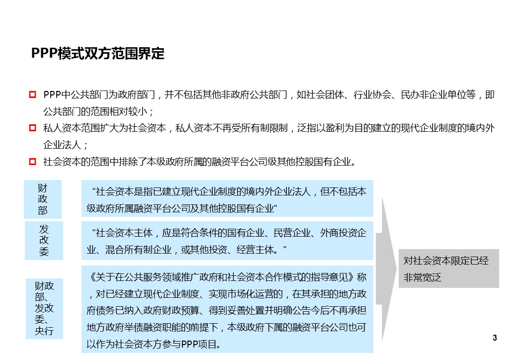 PPP中公共部門為政府部門,并不包括其他非政府公共部門,如社會(huì)團(tuán)體、行業(yè)協(xié)會(huì)、民辦非企業(yè)單位等,即公共部門的范圍相對(duì)較小;私人資本范圍擴(kuò)大為社會(huì)資本,私人資本不再受所有制限制,泛指以盈利為目的建立的現(xiàn)代企業(yè)制度的境內(nèi)外企業(yè)法人;社會(huì)資本的范圍中排除了本級(jí)政府所屬的融資平臺(tái)公司級(jí)其他控股國(guó)有企業(yè)。