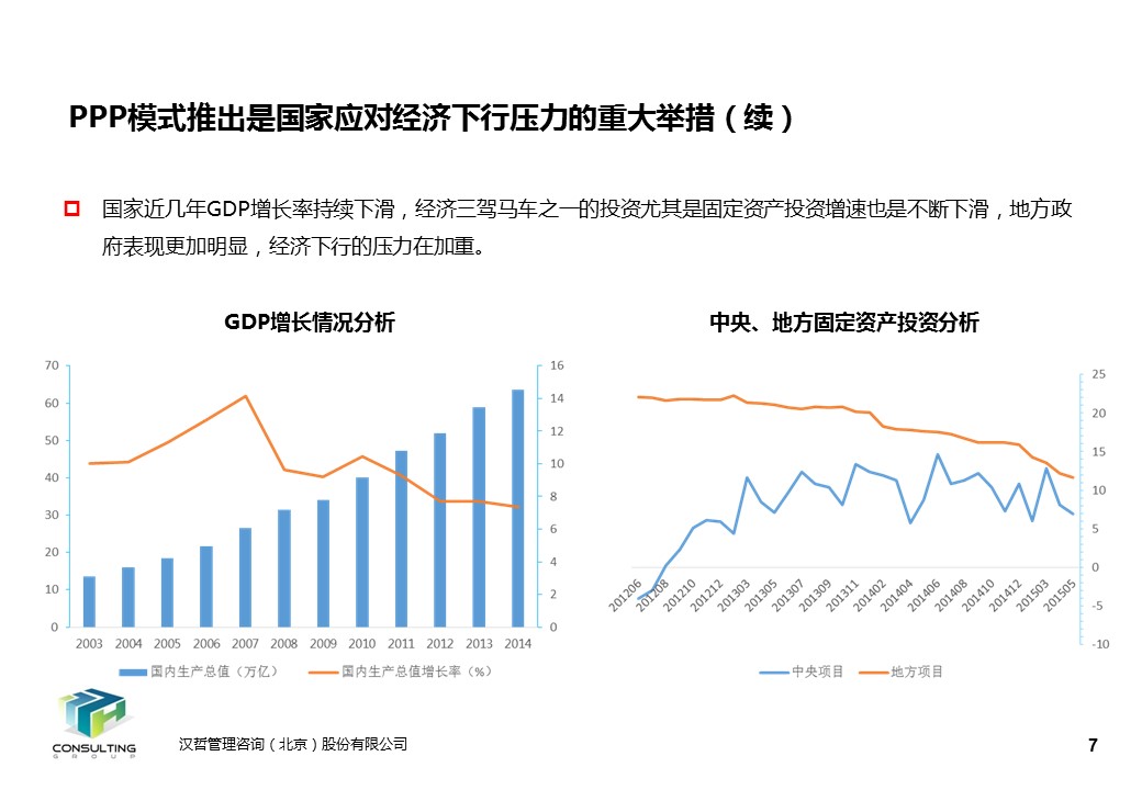 1、PPP模式推出是國(guó)家應(yīng)對(duì)經(jīng)濟(jì)下行壓力的重大舉措:國(guó)家近幾年GDP增長(zhǎng)率持續(xù)下滑,經(jīng)濟(jì)三駕馬車之一的投資尤其是固定資產(chǎn)投資增速也是不斷下滑,地方政府表現(xiàn)更加明顯,經(jīng)濟(jì)下行的壓力在加重。