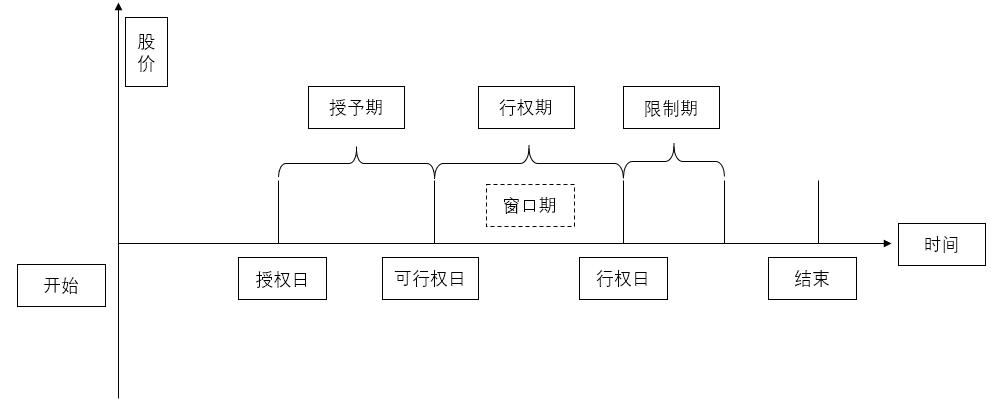 股票期權是一種看漲期權,如圖2-2所示示,經營者獲得行權權的日期為行權權的授予日,行權權授予日和股票期權到期日之間為行權期;在行權權被授予后,經營者可行使期權購買股票。一般情況下,股票期權是無償授予的。也有些公司在授予股票期權時計,為了增加對經理人的約束力, 要求經理人支付一定的費用,就是期權費。