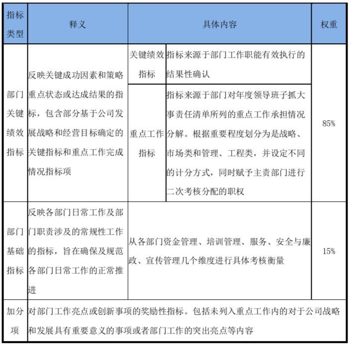部門自評→人力資源部對基礎指標及已完成評價部分的內容進行核實確認→計劃發(fā)展部牽頭對重點工作完成情況進行評判→分管領導對部門關鍵績效指標進行評價→人力資源部、計劃發(fā)展部、監(jiān)察審計部對加分項進行初步評判、提出結果建議→人力資源部匯總初步結果→黨委會審定考核結果→考核結果應用