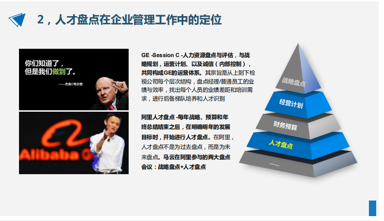 在GE、阿里等企業(yè),“人才盤點”作為與“戰(zhàn)略盤點”比肩而立的一項重要工作,獲得CEO的高度重視與深度參與。人才盤點之于企業(yè)的意義,在于它能夠幫助企業(yè)對人才資源進行有效的識別、使用和儲備,促進人才的戰(zhàn)略性配置;之于個體的意義,在于它能夠幫助員工個體認識能力的優(yōu)劣,揚長補短,發(fā)展提升。