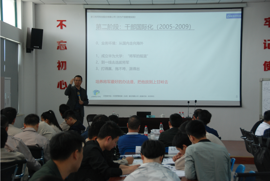 蘇老師首先介紹了華為30年干部發(fā)展的探索之路,四個階段:干部正規(guī)化、干部國際化、干部格式化以及干部年輕化,并詳細(xì)闡述了干部的作用、干部的能力素質(zhì)要求、如何選拔干部、培養(yǎng)干部、任用和評價干部以及干部作風(fēng)建設(shè)等六大模塊。以上內(nèi)容既是華為干部管理的核心,也恰是杭可科技需要學(xué)習(xí)和提升的重點內(nèi)容。