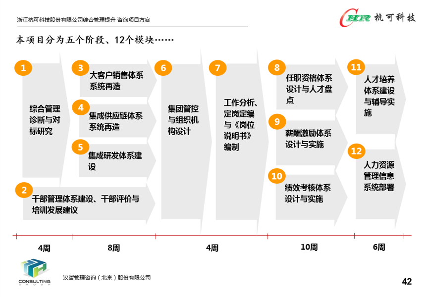 整個項目計劃歷時八個月,將圍繞四個目標,建成四大體系,構建四支隊伍,項目的落地實施將助力杭可科技走上國際化、規(guī)模化與職業(yè)化之路,將注定在企業(yè)的發(fā)展歷史上寫下濃墨重彩的一筆。