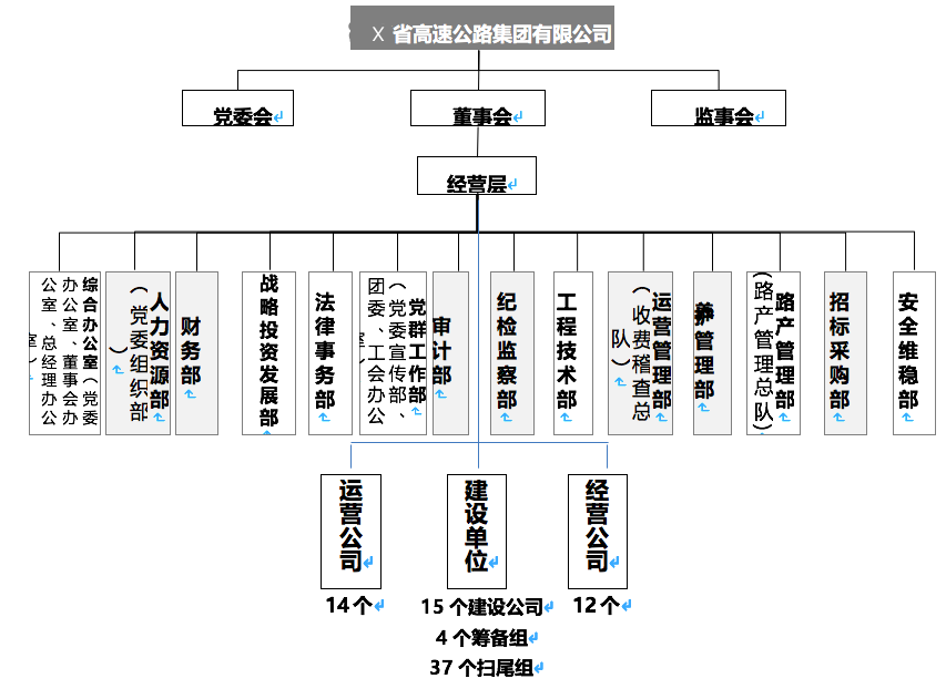該公司成立于1993年3月,在2018年9月27日整體改制,改制后企業(yè)類型變更為“有限責任公司”,主要從事高速公路建設、收費、養(yǎng)護和經(jīng)營開發(fā)以及沿線資源開發(fā) ,同時兼具廣告、地產(chǎn)開發(fā)、物業(yè)、物流等多種衍生業(yè)務;到2018年底,管轄高速公路里程達4969公里,管轄服務區(qū)73.5對;公司資產(chǎn)規(guī)模超過4600億元,營業(yè)收入達到141億元。共有正式員工13000人左右正式員工,4000人左右勞務派遣員工,下設14個市州管理處、1個監(jiān)控中心、15個在建高速公路項目公司、4個項目籌備組、37個掃尾組及12個二級經(jīng)營公司。