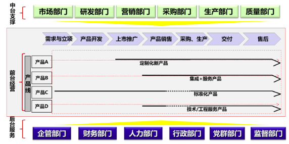 組織運(yùn)作機(jī)制可以整體概括為:前臺(tái)經(jīng)營(yíng)、中臺(tái)支撐、后臺(tái)服務(wù)。流程體系設(shè)計(jì)需要以組織架構(gòu)為基礎(chǔ)和前提,因此,項(xiàng)目組將通過行業(yè)最佳實(shí)踐、能源技術(shù)公司組織運(yùn)作模式分析,與能源技術(shù)公司中高層進(jìn)行充分研討,進(jìn)一步明確組織架構(gòu)及運(yùn)作模式。項(xiàng)目組初步認(rèn)為,能源技術(shù)公司需要建立以產(chǎn)品線為主線,中臺(tái)和后臺(tái)全力支撐產(chǎn)品,從需求立項(xiàng)、開發(fā)、上市推廣、銷售、采購生產(chǎn)、交付、售后的全生命周期組織運(yùn)作機(jī)制,打破部門墻,建立矩陣式柔性組織體系,支撐流程的高效運(yùn)轉(zhuǎn)。