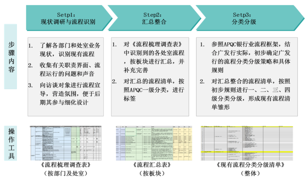 考慮到本次項目的特點,工作組決定采用自下而上的方式開展流程現(xiàn)狀調(diào)研與清單梳理工作,如下圖所示,按照現(xiàn)狀調(diào)研與流程識別、匯總整合、分類分級三個步驟,并在流程清單梳理的過程中,收集和分析流程問題。