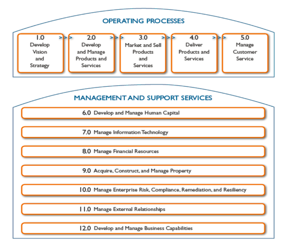 從流程清單架構(gòu)上,工作組借鑒研究了AQPC(美國生產(chǎn)力與質(zhì)量中心American Productivity and Quality Center)開發(fā)的銀行業(yè)流程框架(Process Classification Freamwrok,簡稱PCF),以此為標桿,分析銀行當前流程清單架構(gòu)的完整性、分布合理性。