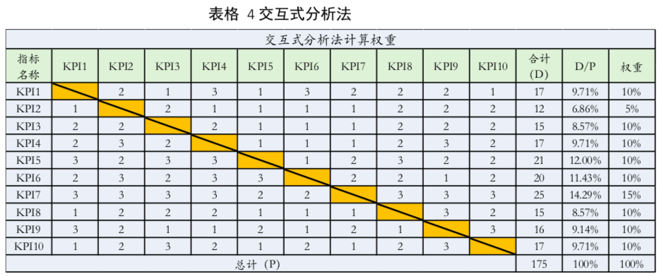 但是在咨詢實(shí)踐中,一般采用經(jīng)驗(yàn)法,但在權(quán)重不易確定的情況下,可運(yùn)用交互式分析法,通過兩兩比較,計(jì)算出指標(biāo)的相對(duì)重要性。