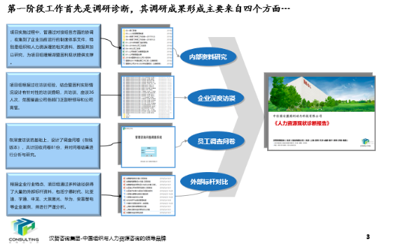 項(xiàng)目原計劃第一階段進(jìn)行戰(zhàn)略澄清,旨在通過調(diào)研、對標(biāo)與管理診斷,發(fā)現(xiàn)并剖析組織存在的根本問題,通過對戰(zhàn)略的梳理與澄清,明確未來的管理提升日程表,指明方向并明確優(yōu)先次序。實(shí)際實(shí)施過程中,客戶核心領(lǐng)導(dǎo)認(rèn)為新能源汽車行業(yè)政策的不確定性,公司戰(zhàn)略很難明確,因此項(xiàng)目組選擇了通過內(nèi)部資料研究、企業(yè)深度訪談、員工調(diào)查問卷、外部標(biāo)桿資料對比,政策研究等維度,對其戰(zhàn)略、組織、人力資源管理、組織文化等進(jìn)行全面診斷,發(fā)現(xiàn)問題并提出改進(jìn)的思路。