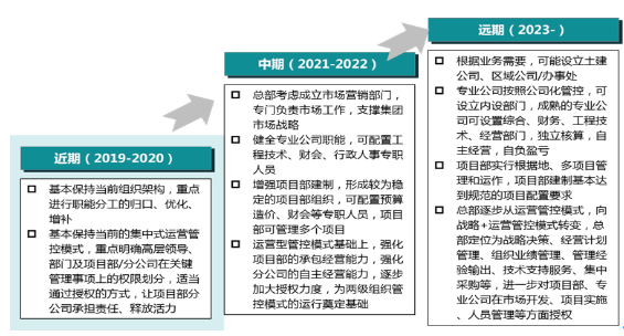 圍繞公司的五年規(guī)劃,提出其組織管控的三個(gè)階段發(fā)展路線圖,據(jù)此提出近期、中期、遠(yuǎn)期三個(gè)階段的組織優(yōu)化方案,細(xì)化近期和中期的部門(mén)職責(zé)劃分。