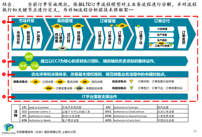 項目組針對公司在生產(chǎn)運營中凸顯的問題,應(yīng)用波特的價值鏈模型與華為的LTC訂單業(yè)務(wù)模型對公司各項業(yè)務(wù)活動進(jìn)行了分析和優(yōu)化,提出主業(yè)務(wù)流程框架及業(yè)務(wù)與支撐流程清單。