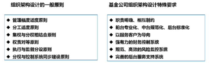 通過對(duì)標(biāo)分析,發(fā)現(xiàn)在設(shè)計(jì)基金投資公司組織架構(gòu)時(shí)除了遵循組織架構(gòu)設(shè)計(jì)的一般原則外,還要符合基金行業(yè)的法規(guī)和規(guī)范。