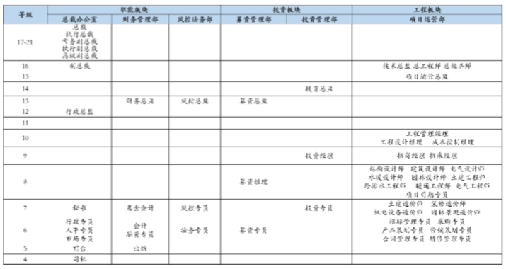 鑒于實(shí)業(yè)公司和實(shí)業(yè)公司發(fā)展基金目前發(fā)展階段的特點(diǎn),由咨詢顧問進(jìn)行崗位價(jià)值評(píng)價(jià),得到《職等架構(gòu)表》,職等架構(gòu)重點(diǎn)體現(xiàn)在基金業(yè)務(wù)和項(xiàng)目運(yùn)營管理業(yè)務(wù)上