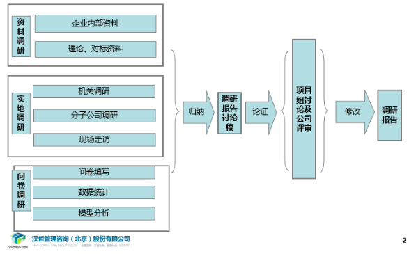 對公司機關(guān)和各分子公司進行深入調(diào)研。共計深入專訪102人次,開展員工座談會3場,形成訪談紀(jì)要20余萬字;進行多次車間現(xiàn)場走訪;開展問卷調(diào)查,收集3143份樣本;針對各業(yè)務(wù)與職能條線開展專項問題調(diào)研;對國內(nèi)外行業(yè)標(biāo)桿企業(yè)進行深度研究;對內(nèi)外部相關(guān)資料進行嚴(yán)謹(jǐn)分析。