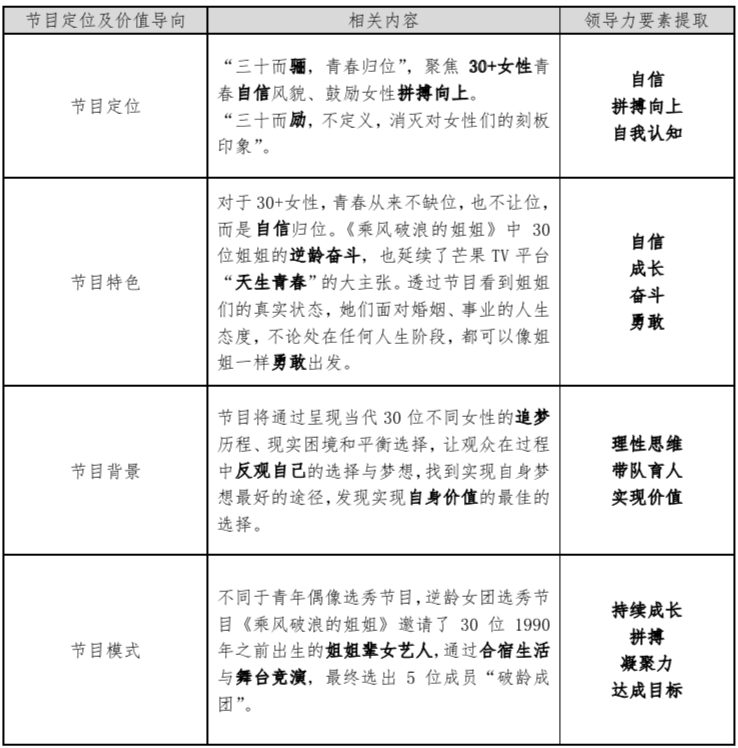 而在此背景下,參加節(jié)目的30位“小姐姐”的身上,尤其是每次分組選取的團(tuán)隊(duì)leader的身上更應(yīng)該體現(xiàn)與其價(jià)值定位相適應(yīng)的的領(lǐng)導(dǎo)力要素,從而使其帶領(lǐng)的團(tuán)隊(duì)能無(wú)限放大節(jié)目傳遞的價(jià)值觀。