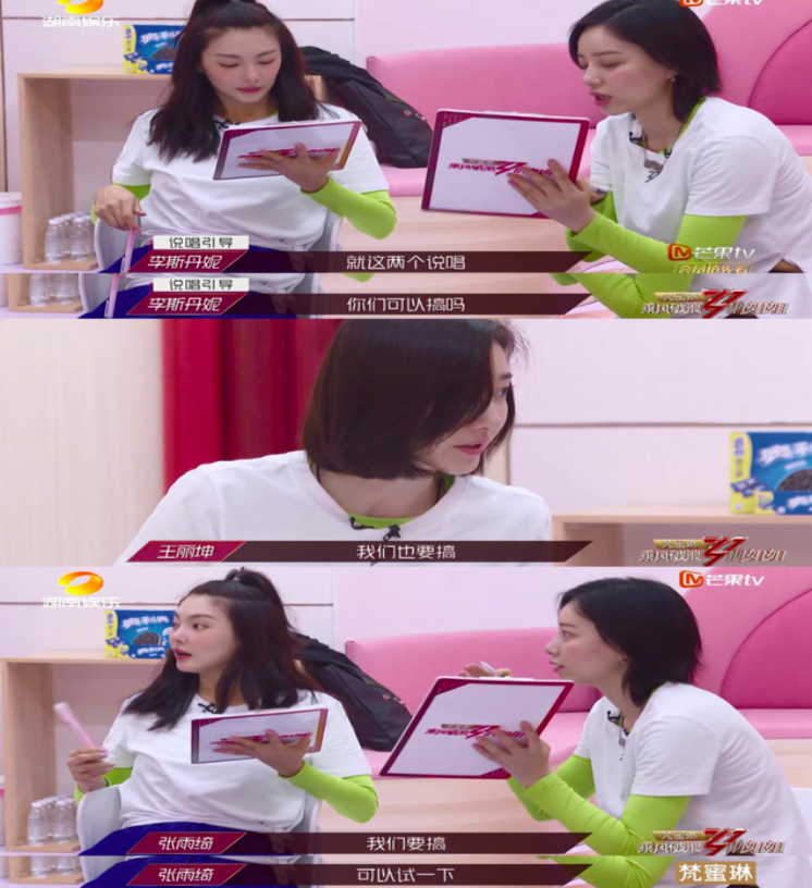 情景10:張雨綺組里有兩個(gè)演員,讓這個(gè)組有著極大的短板。面對(duì)公演曲目中的兩段RAP,在專業(yè)的李斯丹妮提出要不要挑戰(zhàn)的時(shí)候,張雨綺立即說(shuō)“我們要搞”,并帶動(dòng)并不自信的王麗坤勇敢地邁出第一步。