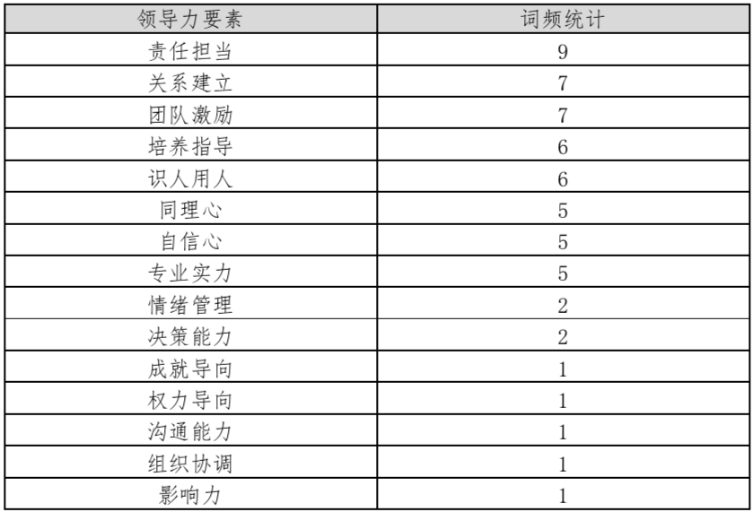 將出現(xiàn)頻率較高的要素提取出來(lái)為: 責(zé)任擔(dān)當(dāng)、關(guān)系建立、團(tuán)隊(duì)激勵(lì)、培養(yǎng)指導(dǎo)、識(shí)人用人、同理心、自信心、專業(yè)實(shí)力。