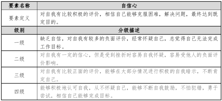 根據(jù)上述構(gòu)建的領(lǐng)導(dǎo)力模型,筆者參考“漢哲咨詢”開(kāi)發(fā)的《HAN-82勝任力模型分類詞典》,對(duì)此次構(gòu)建的領(lǐng)導(dǎo)力模型的九個(gè)要素分別進(jìn)行了指標(biāo)定義及分級(jí)標(biāo)準(zhǔn)描述。比如:自信心:
