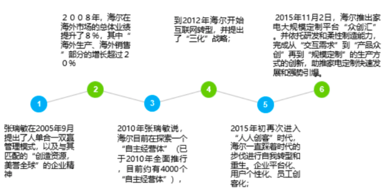 人單合一自主經(jīng)營模式就是在海爾為了企業(yè)內(nèi)部組織架構(gòu)能適應(yīng)外部國際化市場的變化這一標(biāo)準(zhǔn)下,在內(nèi)部開展組織管理體制和業(yè)務(wù)流程再造的情況下誕生和發(fā)展的。