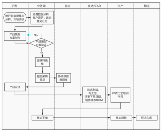1. 服裝產(chǎn)品的企劃、設(shè)計及研發(fā)。服裝產(chǎn)品的設(shè)計開發(fā)以企劃中心為主導(dǎo),由業(yè)務(wù)、供應(yīng)、技術(shù)、生產(chǎn)等部門共同參與決策。從趨勢信息收集到新產(chǎn)品樣衣完工的整體流程如下圖所示。