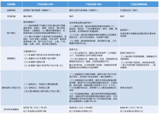 酷特智能以個性化定制為核心的服裝生產(chǎn)及銷售,主要包括個性化定制ODM、個性化定制OBM、個性化定制職業(yè)裝三種銷售模式。對于境內(nèi)外的B端客戶,公司以貼牌方式進行生產(chǎn);對于境內(nèi)的C端客戶以及職業(yè)裝團體訂單客戶,公司以自有品牌進行生產(chǎn)銷售。ODM模式,是酷特為B端客戶提供產(chǎn)品開發(fā)、設(shè)計、改進、設(shè)備投入、生產(chǎn)、售后、市場反饋的全過程,將個性化定制融合在整個的設(shè)計加工過程。OBM模式,是酷特自建品牌,進行市場定位,產(chǎn)品設(shè)計、制造、營銷渠道建立,及品牌的打造。(表3:酷特智能三種銷售模式的對比梳理)