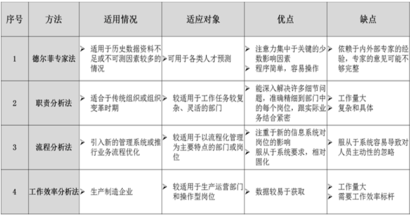定編的方法也有很多,比如德爾菲專家法、職責(zé)分析法、流程分析法、工作效率分析法等。各自有其優(yōu)缺點(diǎn)。具體如下: