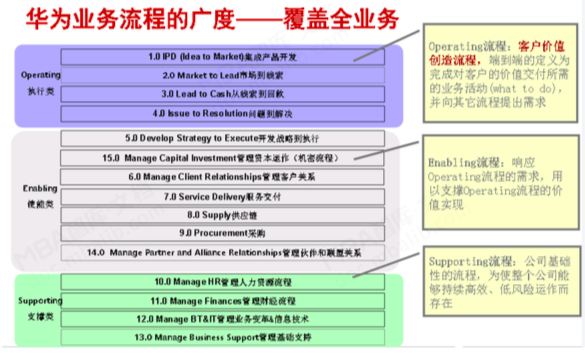 流程是華為內(nèi)部溝通的語言與溝通方式,也是華為核心價(jià)值觀——以客戶為中心,在業(yè)務(wù)領(lǐng)域最直觀的體現(xiàn)。華為的流程始于客戶需求的牽引,而且在內(nèi)部的流程接續(xù)上也是服務(wù)導(dǎo)向,面向“客戶”交付。以下是華為的流程框架圖,業(yè)務(wù)流程涵蓋了經(jīng)營(yíng)管理的各大領(lǐng)域和條線。