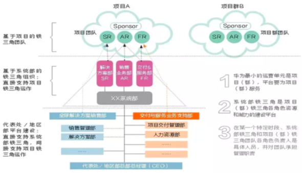 基于失利的教訓(xùn),華為蘇丹代表處對(duì)團(tuán)隊(duì)整體的組織結(jié)構(gòu)進(jìn)行了重塑:打破原有部門的邊界束縛,圍繞用戶需求,有效協(xié)同客戶關(guān)系、產(chǎn)品與解決方案、交付與服務(wù)、商務(wù)合同、融資回款等獨(dú)立部門;圍繞特定的客戶項(xiàng)目,組建專門的核心管理團(tuán)隊(duì),將以往復(fù)雜多樣的客戶接口協(xié)調(diào)統(tǒng)一,更有效地幫助客戶創(chuàng)造商業(yè)價(jià)值。蘇丹辦事處的項(xiàng)目管理團(tuán)隊(duì)以客戶經(jīng)理(AR)、解決方案專家/經(jīng)理(SR/SSR)、交付專家/經(jīng)理(FR)為核心,建構(gòu)出一個(gè)面對(duì)面主動(dòng)對(duì)接客戶、聚焦項(xiàng)目、能夠快速反饋和響應(yīng)的一線作戰(zhàn)單元,從而更深入精準(zhǔn)地理解把握了客戶需求。這種項(xiàng)目核心管理團(tuán)隊(duì)的組織模式被形象地稱為“鐵三角”。