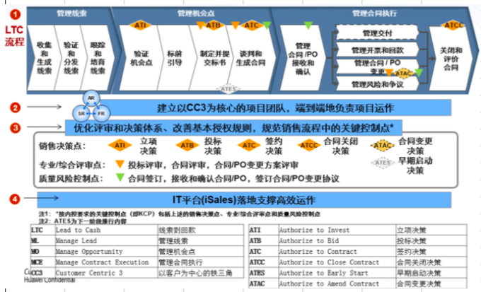 2007年開始,華為與咨詢機(jī)構(gòu)合作了CRM(客戶關(guān)系管理)項(xiàng)目,推動(dòng)了LTC變革,加強(qiáng)從“機(jī)會(huì)到訂單,到現(xiàn)金”的流程管理。2008年,對(duì)CRM體系進(jìn)行重新梳理,打通從“機(jī)會(huì)到合同,再到現(xiàn)金”的全新流程,提升了公司的運(yùn)作效率。LTC流程是從營(yíng)銷視角建立的“發(fā)現(xiàn)銷售線索-培育線索-將線索轉(zhuǎn)化為訂單-管理訂單執(zhí)行/匯款”,端到端的流程。