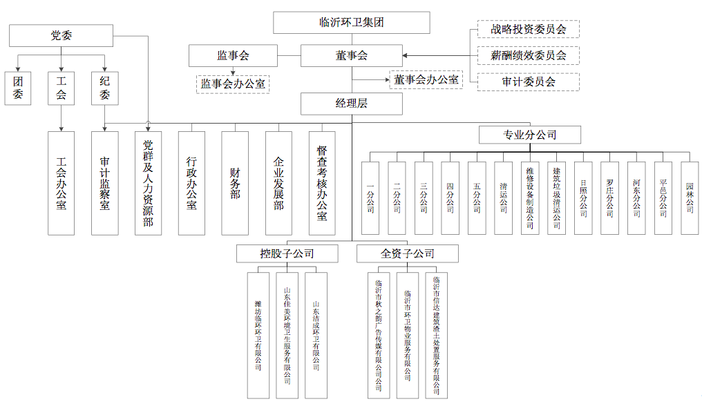 目前,集團(tuán)總部?jī)?nèi)設(shè)辦公室、財(cái)務(wù)審計(jì)部、黨群及人力資源部、企業(yè)發(fā)展部、工會(huì)辦公室、督察考核辦公室、紀(jì)檢監(jiān)察室和環(huán)衛(wèi)綜合服務(wù)中心等8個(gè)部室。下設(shè)有一分公司、二分公司、三分公司、四分公司、五分公司、羅莊分公司、河?xùn)|分公司、日照分公司、建筑垃圾清運(yùn)公司、環(huán)衛(wèi)設(shè)備研發(fā)制造維修公司等近20個(gè)專業(yè)分公司。