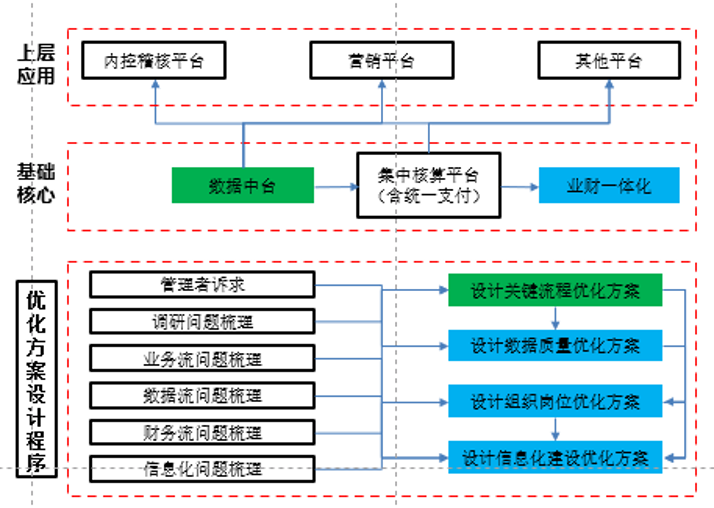 交叉式式分階段實施,以業(yè)財一體化及關(guān)鍵流程優(yōu)化為主線,完成整體優(yōu)化方案設(shè)計。