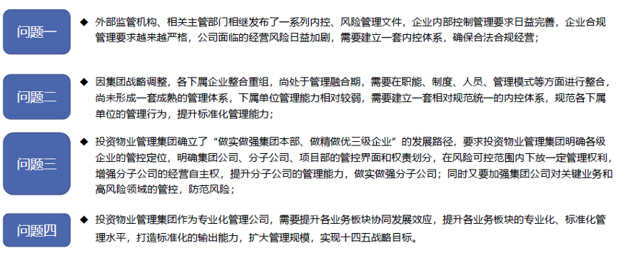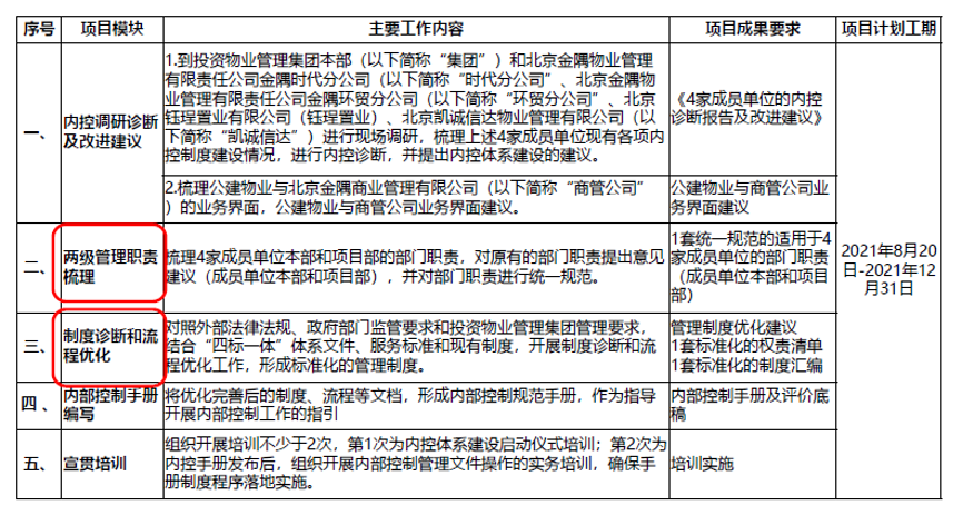 3、從金隅投資物業(yè)本次咨詢需求看,不單純是傳統(tǒng)的模板化、制式化的內(nèi)控文本體系建設(shè),而是在職責(zé)澄清、制度及流程優(yōu)化方面,也提出了更深層次的要求: