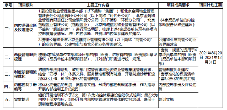 根據(jù)投資物業(yè)管理集團(tuán)內(nèi)部控制體系規(guī)劃,為加快實現(xiàn)內(nèi)控體系同業(yè)管控,針對金隅時代分公司、金隅環(huán)貿(mào)分公司、北京鈺珵置業(yè)有限公司、北京凱誠信達(dá)物業(yè)管理有限公司的實際需求,擬為四家公司共同選聘1家咨詢機(jī)構(gòu),建立1套適合公建物業(yè)類企業(yè)的內(nèi)控體系: