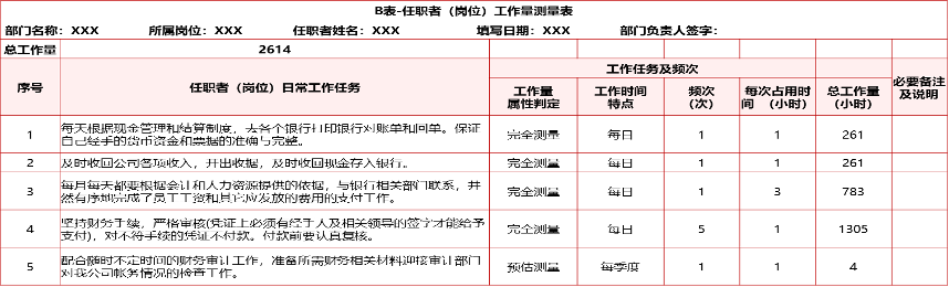 (1)《定崗定編職能套表》回收與修訂:回收各部門(mén)提交的《定崗定編職能套表》,對(duì)填寫(xiě)內(nèi)容的規(guī)范性、合理性進(jìn)行審核,并與部門(mén)負(fù)責(zé)人進(jìn)行溝通、核對(duì)、最終確認(rèn)各崗位工作量;