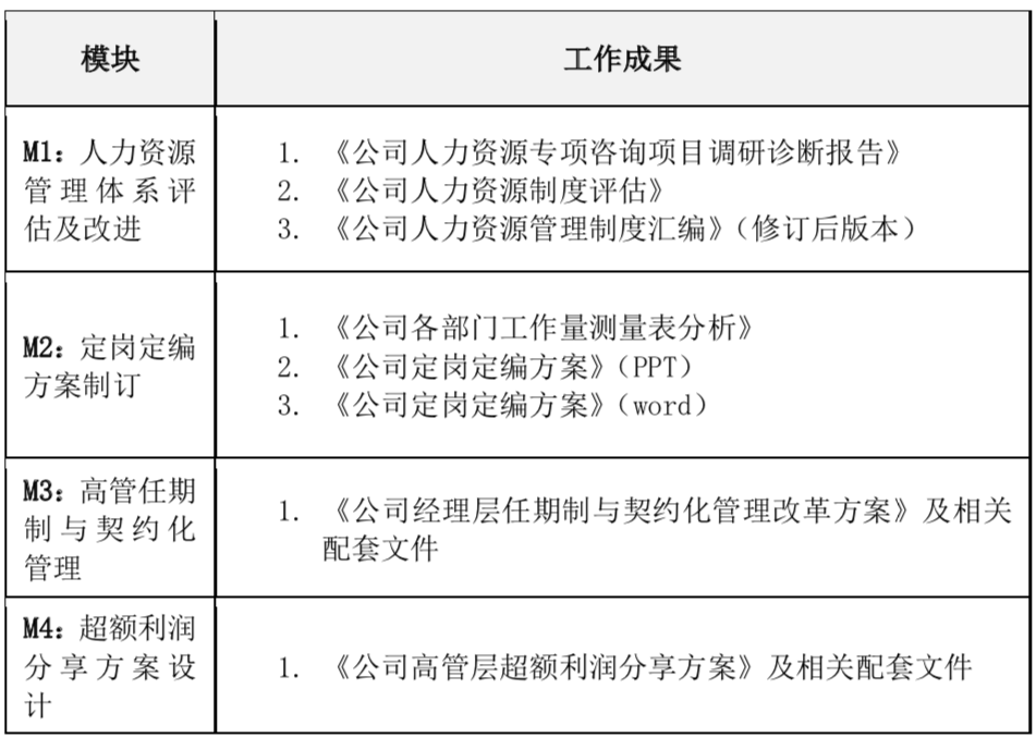 整體解決方案分為四個(gè)階段:人力資源管理體系評(píng)估、定崗定編方案制定、高管任期制與契約化管理、超額利潤(rùn)分享方案設(shè)計(jì)。如下圖: