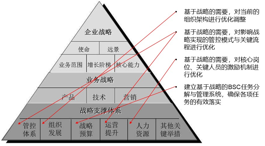同時,又要全面理順企業(yè)戰(zhàn)略、業(yè)務(wù)戰(zhàn)略與戰(zhàn)略支撐體系的關(guān)系,對其中的關(guān)鍵體系進行 戰(zhàn)略性優(yōu)化與調(diào)整:
