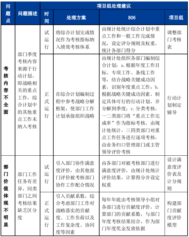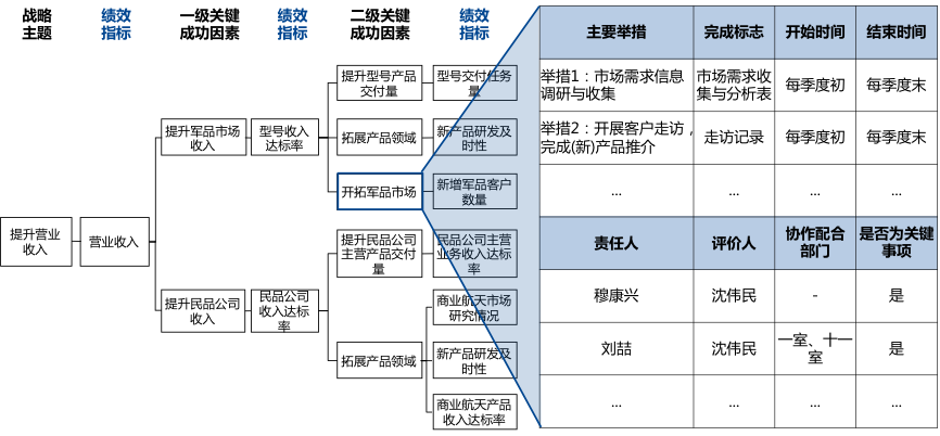 圍繞關(guān)鍵成功因素,制定實(shí)現(xiàn)關(guān)鍵成功因素的行動計(jì)劃。行動計(jì)劃是把關(guān)鍵成功因素轉(zhuǎn)化為具體、可實(shí)施的行動舉措,并明確行動舉措的完成時間、完成標(biāo)志及責(zé)任人。行動計(jì)劃一方面可將結(jié)果性指標(biāo)分解、細(xì)化為具體工作任務(wù),作為過程指標(biāo),使指標(biāo)兼顧過程和結(jié)果;另一方面可將部門工作任務(wù)落實(shí)到人,為崗位考核提供基礎(chǔ),實(shí)現(xiàn)組織目標(biāo)的層層落地。