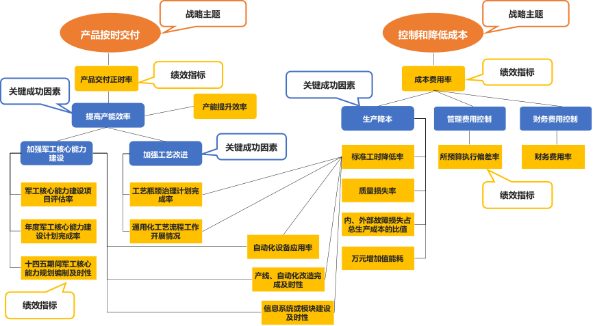 從戰(zhàn)略目標(biāo)出發(fā),層層梳理戰(zhàn)略主題、關(guān)鍵成功因素與指標(biāo)的邏輯關(guān)系,同時分析指標(biāo)間相互影響關(guān)系,進(jìn)一步識別影響戰(zhàn)略目標(biāo)的核心績效指標(biāo)。通過繪制樹狀的指標(biāo)關(guān)系圖,明確各個指標(biāo)與戰(zhàn)略的相關(guān)性,以此判斷指標(biāo)的戰(zhàn)略重要性,并根據(jù)指標(biāo)與其他指標(biāo)的關(guān)系判斷該指標(biāo)的影響范圍,幫助管理者定位需關(guān)注的關(guān)鍵領(lǐng)域。通過指標(biāo)關(guān)系圖可明確指標(biāo)的戰(zhàn)略重要性及影響度,以此為參考篩選核心指標(biāo)。