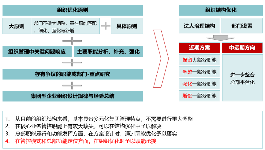 根據(jù)以上思路,重點(diǎn)研究了審計(jì)職能向上歸屬、戰(zhàn)略與產(chǎn)業(yè)發(fā)展職能建設(shè)與管理、招采職能管理、煤炭質(zhì)量管理等。同時(shí)對(duì)總部核心職能進(jìn)行逐一梳理,提出增補(bǔ)、修正的建議。形成優(yōu)化方案。