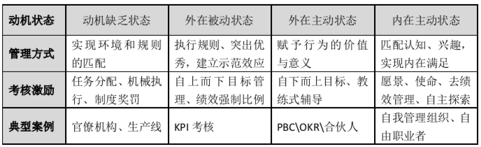 在企業(yè)層面,員工整體的動機狀態(tài),會與企業(yè)的行業(yè)特性、發(fā)展成熟度、管理風(fēng)格、企業(yè)文化等因素相關(guān),同時也具備時效性和個體差異性。合適的導(dǎo)向性管理下,員工行為動機可能從外在被動狀態(tài)提升至外在主動狀態(tài),但不良的管理導(dǎo)向會使員工行為動機狀態(tài)下滑。