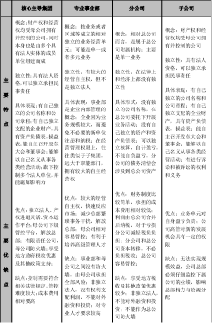 以上四種典型組織架構(gòu)差異化的核心在于中間層的二級組織的設(shè)置問題,二級組織主要是以核心主導(dǎo)集團(tuán)、事業(yè)部、分公司與子公司四種組織方式存在,各方式的特征如下: