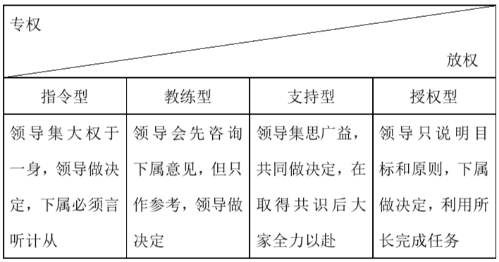 第四種為授權(quán)型領(lǐng)導(dǎo),相信員工的能力,將工作任務(wù)交由員工全權(quán)負責、獨立作業(yè),僅在必要時提供適當?shù)馁Y源,將決策和解決問題的責任都托付給員工。當然有些工作是不能授權(quán)的,如人事任命、機密事務(wù)、決策事務(wù)、危機工作和上級領(lǐng)導(dǎo)讓你親自做的事情。