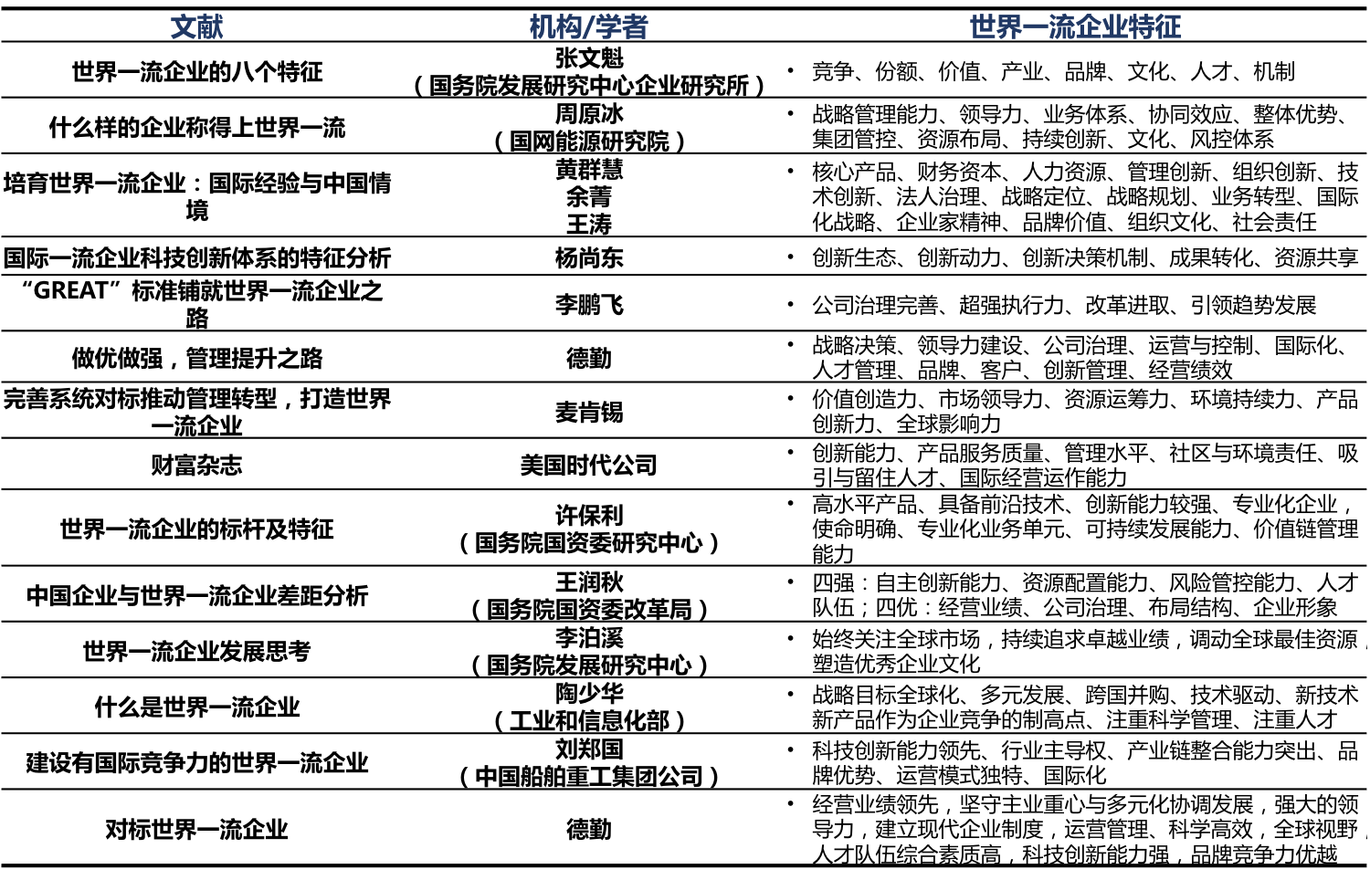 學界對“世界一流企業(yè)”的概念定義各不同相同,但“世界一流企業(yè)”應(yīng)具有始終關(guān)注全球市場、持續(xù)追求業(yè)務(wù)卓越、能夠合理分配全球資源、盡心塑造先進企業(yè)文化等優(yōu)質(zhì)特征。