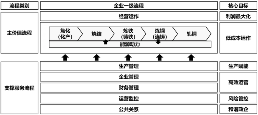 二、進(jìn)行一級流程梳理分析。根據(jù)企業(yè)價值鏈(本文略過),借鑒流程管理最佳實(shí)踐,對企業(yè)業(yè)務(wù)運(yùn)行的一級流程模塊進(jìn)行梳理,并將其分為兩大類:主價值流程(經(jīng)營運(yùn)作、產(chǎn)品實(shí)現(xiàn))、支撐服務(wù)類流程(生產(chǎn)管理、企業(yè)管理、財務(wù)管理、運(yùn)營監(jiān)控、公共關(guān)系)。同時,根據(jù)不同的一級流程在企業(yè)運(yùn)行過程中的定位,進(jìn)一步明確一級流程的核心目標(biāo),如下圖所示: