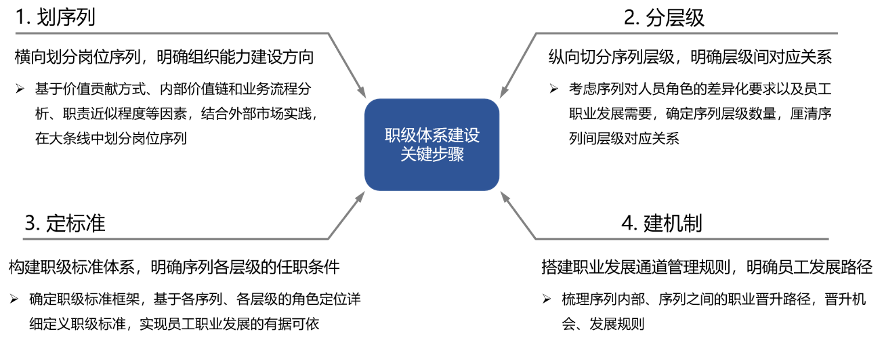 職級體系建設(shè)項(xiàng)目整體按“劃序列、分層級、定標(biāo)準(zhǔn)、建機(jī)制”四個(gè)步驟開展工作: